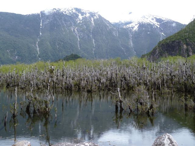 Beautiful country narrow unpaved road. Lots of photos of waterfalls lakes with craggy mountains surrounding. Post & rail fences and fencing from logs put in vertically. Swampy areas with dying trees in them look rather like ti tree. Reach the lunch truck after mostly downhill dirt. Getting faster and reading the road better.