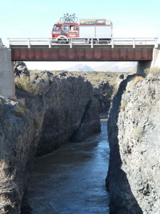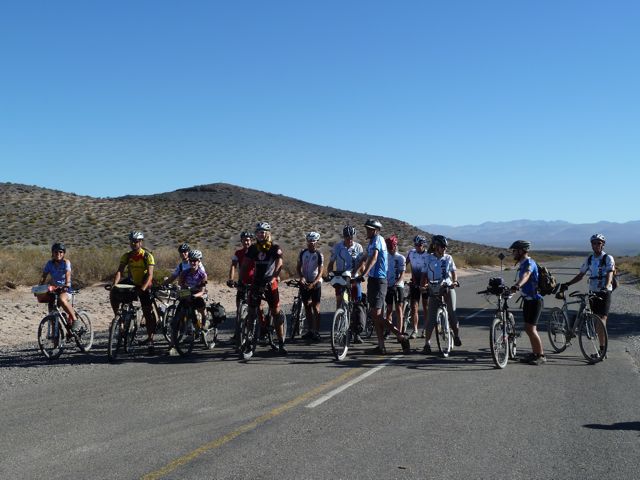 Great start For a climb from 1100m to 1600 on sealed rd to rocky gorge of Rio Grande. Then flat on dirt and temp up to 38c, uphill to lunch. Anna riding with Eric. Main rd so lots of corrugations, falls no 5 & 6 only scrapes one to the same elbow.