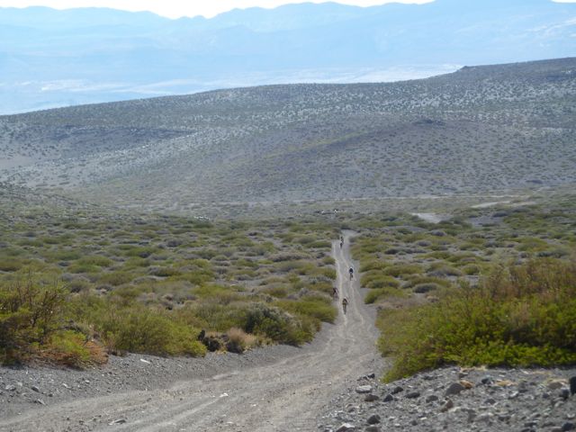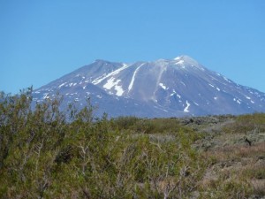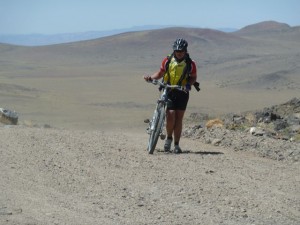 Climb from 1100m to 2200 on dirt passed extinct volcano. 8.00 start that usually indicates a tough day. Up the main highway for 5 ks then onto dirt. On and up. Wind and steep climb. Dirt not too bad at this stage but soft in places. Wind behind blows me along at speed. Up very steep track bottom granny gear, just made the last bit. Snow covered volcano in distance. Wait for Anna & others.