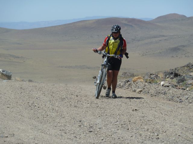 Surrounding vegetation sparse, clumps of spiney grasses & occasional yellow flowers. Hills with volcano in distance. Down hill to pass a small farm area green in contrast then up. The full force of the wind starts. Must be gusting up to 80 to 90 k. Have to stop & walk the bike. Can occasionally get on but difficult as soft dirt no traction and the wind. Blown off the track and walk again. 4 of us together. We are aiming for lunch at the volcano. Crest a rise & track a bit flatter but still head or side wind. Up a slight incline into soft & wind blows me over onto bad elbow. That’s it 2.00 so 6 hours to cover 35k. Anna & Eric go on, I find a sheltered spot in the sun & have a nanna nap. 2.30 I wake up to find the truck in front of me for a pick up with Anna already in it. I think she thought I was dead!