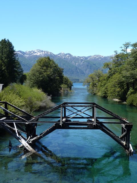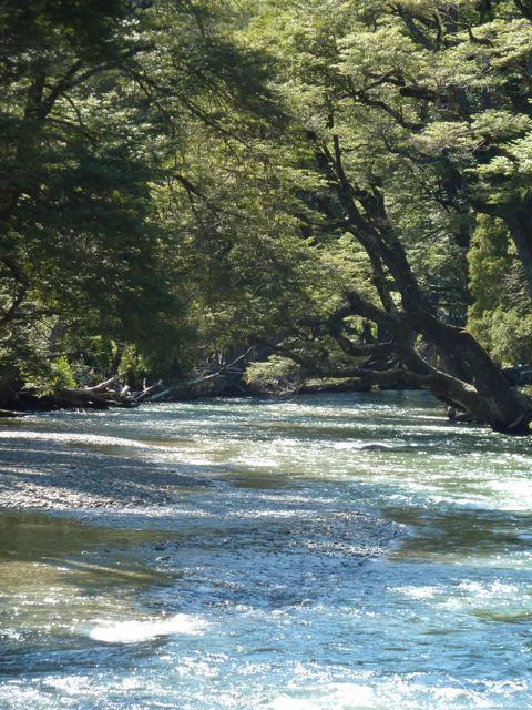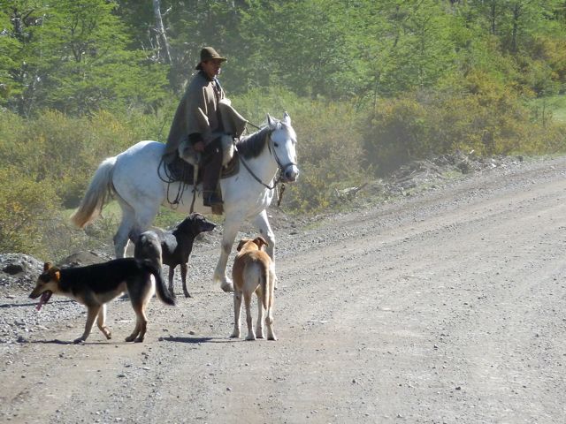 Pass a goucho on horseback with 3 well trained dogs attending. Lunch truck overlooks yet another lake. Sit soaking up the sun. They are making a new road here which will probably be sealed in coming years. Over a bridge, look down into the water so deep but clear enough to see the bottom in detail. A fly fisherman under the bridge. He won’t catch anything as I can see no fish there. Wrong time of the day.